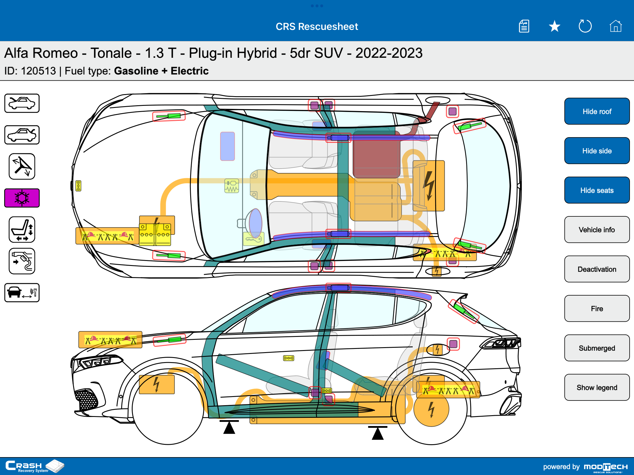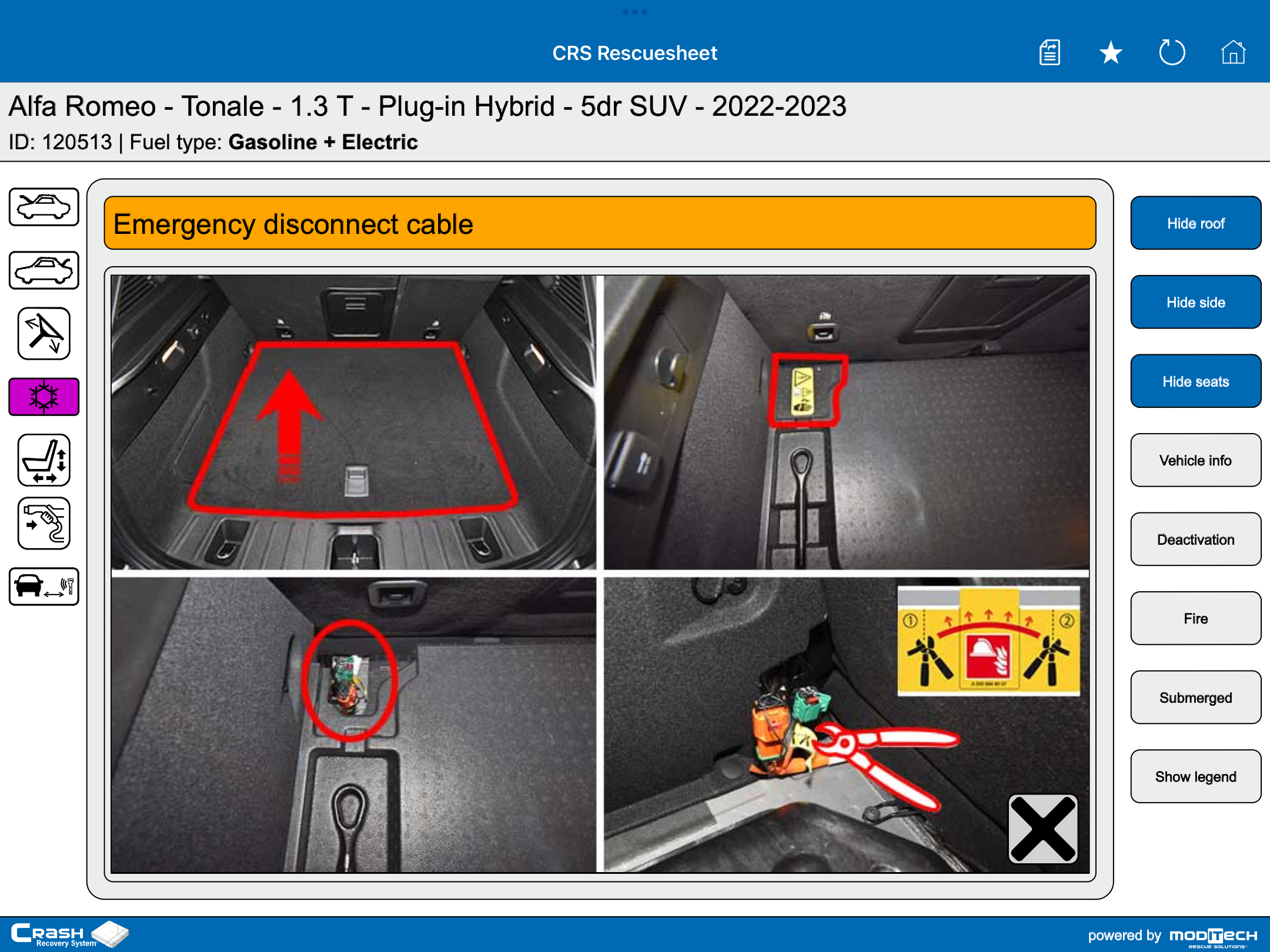 Für die Stilllegung des Fahrzeugs und die Deaktivierung des Hochspannungskreises wurden die unverzichtbaren Informationen des Crash Recovery Systems genutzt, dem einzigen digitalen Informationssystem, in dem das Rettungsblatt dieses Tonale PHEV bereits verfügbar ist. Die Abfrage war sehr einfach und erfolgte über das Kennzeichen des Alfa im Kennzeichenauswahlverfahren des CRS.